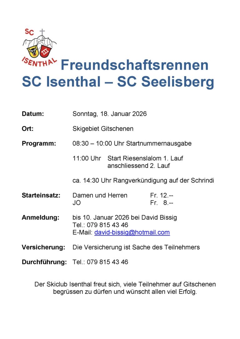 Sofern Frau Holle mitmacht starten wir am 18. Januar 2026 mit dem Freundschaftrennen SC Isenthal – SC Seelisberg auf Gitschenen mit dem ersten Skirennen. Anmeldeschluss ist der 10.01.2026, bitte direkt bei David Bissig anmelden.